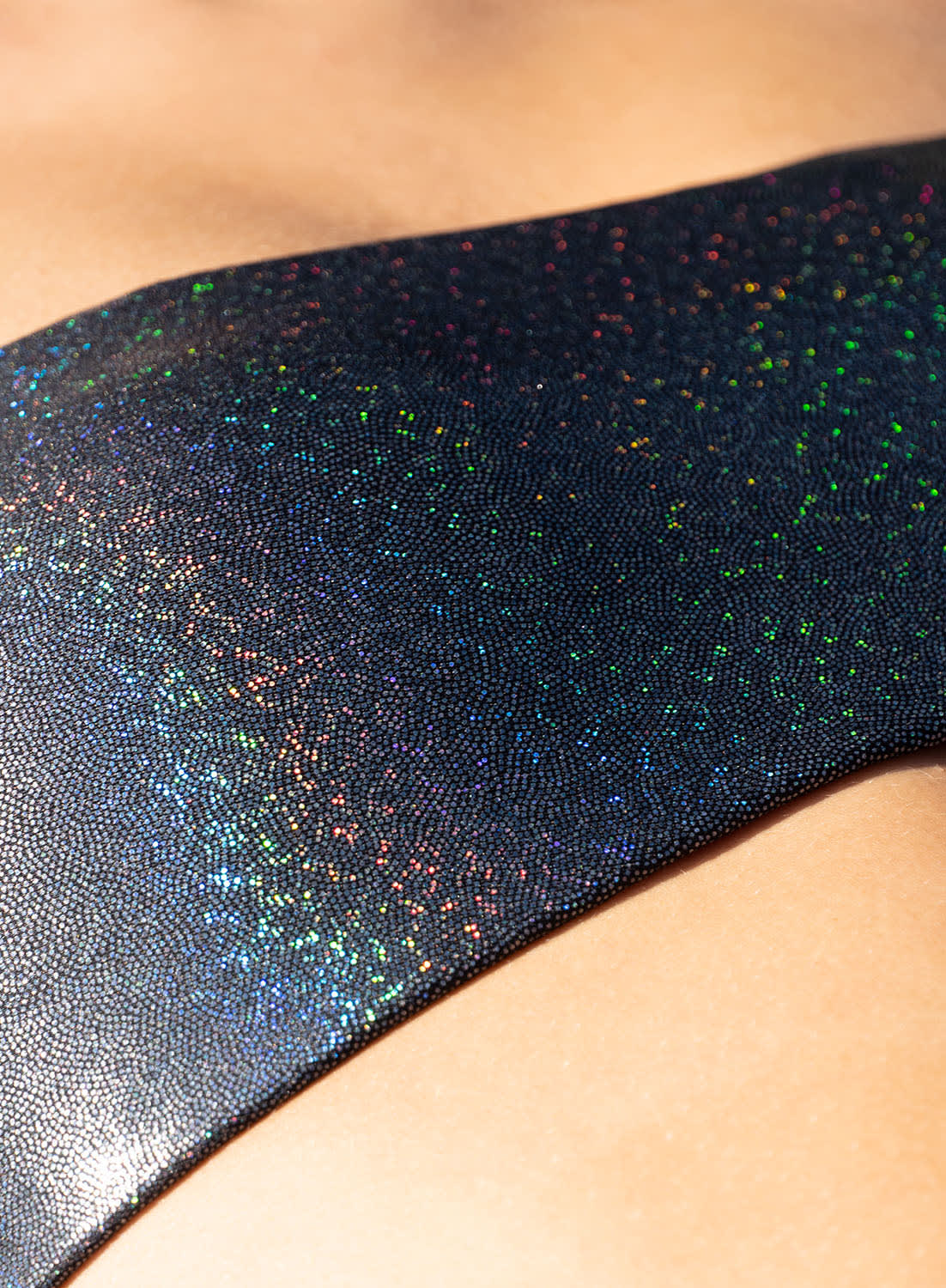Este bikini es algo rebelde. Aunque el alma del tejido es negra, destaca por su brillantez arcoiris. El top de estilo bandeau con cierre lateral está diseñado para aguantar sin deslizar (vamos, que no lo perderás). La braguita alta combina perfectamente y estiliza las piernas. Hecho en Barcelona